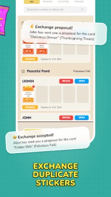 Receive offers from other players, check reliability through our rating system, and accept the best proposals. Quickly find your missing cards and complete your album without hassle.